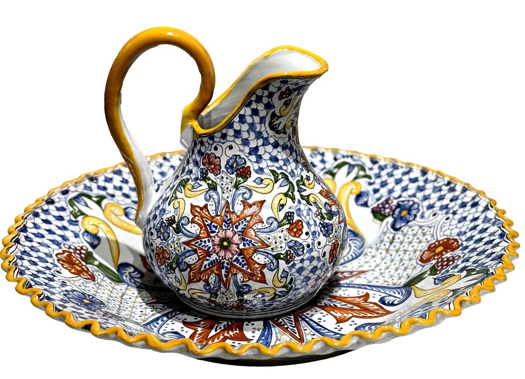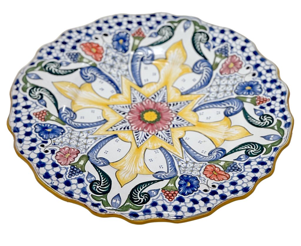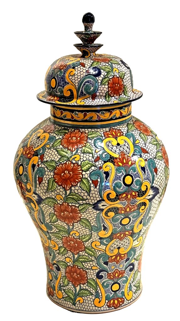 Our next type of pottery encountered was the ubiquitous Talavera style, which originated in the 16th century Puebla, Mexico, when Spanish potters from Spain’s Talavera de la Reina introduced their tin-glazed majolica techniques to local artisans. Influenced by Moorish, Asian, and indigenous peoples, the pottery boasts a milky-white glaze with vibrant, intricate patterns. The process for creating these pieces is more standard – shaped on a potter’s wheel, left to dry, fired in a kiln, glazed with white base, and then hand-painted with designs before the final firing. There are two main varieties of Talavera – one is the multicolored version of pottery seen here, and the other is a strictly blue and white version influenced by Chinese and Delft colors and glazes of blues and whites.