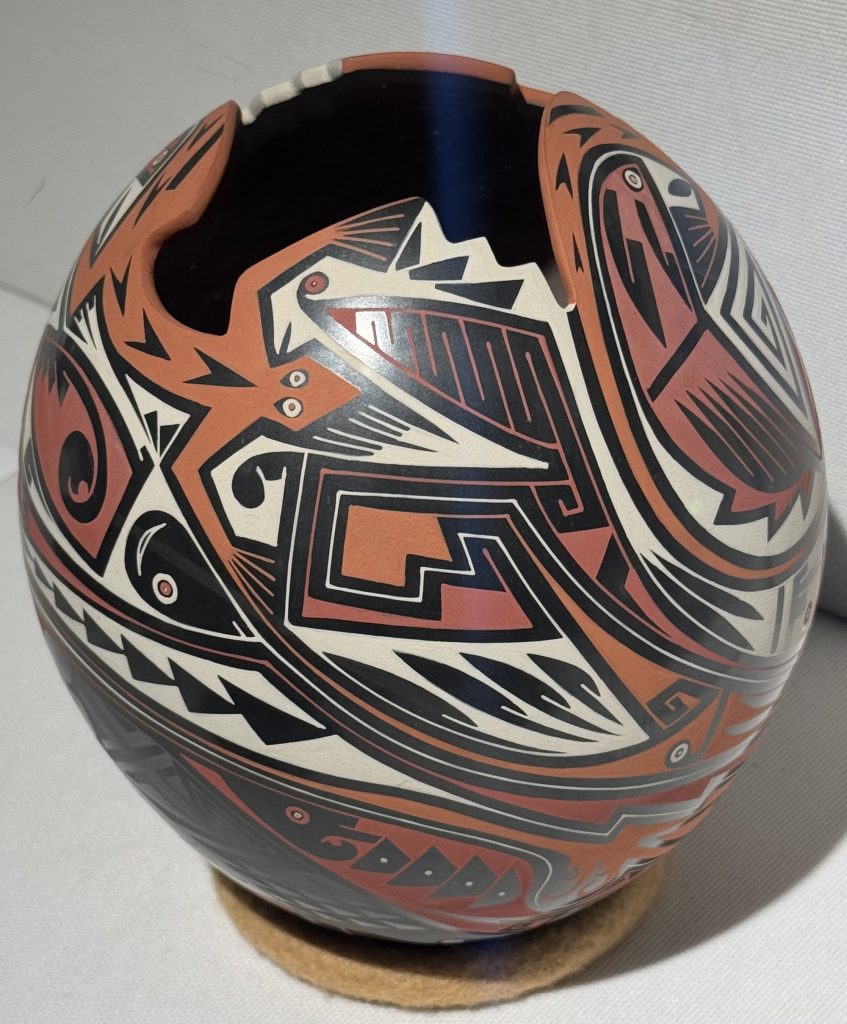 This pot, made by Jesus Navarrete Ortiz, is red clay with polychrome designs, from 2009. Contrary to how we build much pottery now, this is hand-built, not using a wheel. The craftsman starts by rolling out a thin clay slab or “tortilla” and pressing it into a shallow, dish-like plaster form. They then roll and form a large coil of clay and join the ends to make a ring. Repeated pinching and forcing the clay upwards yields the walls of the pot.