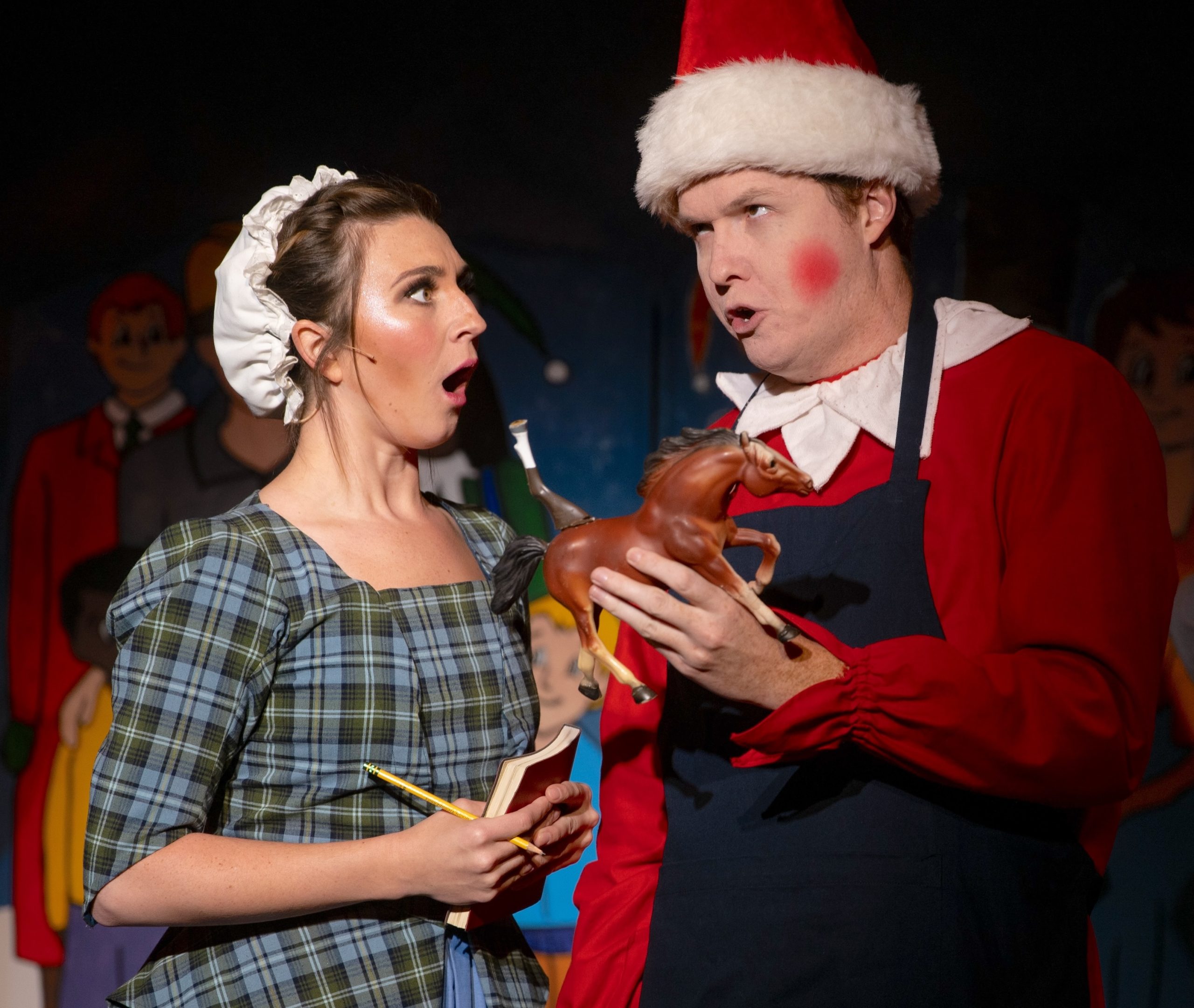 In its initial iteration, Milking Santa was for eight actors who played a variety of roles and who made lightning-fast costume changes a part of the breathless comedic energy of the show. With more space available, this year’s production features 22 players: the eight core players plus an additional ensemble of four adults, eight young professionals ages 11 through 17, and two musicians. (Scenic design is by Mark Exline, costumes by Nancy Robinson, choreography by Jenise Cook, sound design by Daisy Melton, lighting by Zan De Spelder.) Despite MTH’s additional space, “with 22 players onstage, we still plan on this being just as crazy as ever,” Rusty said. “I really think that’s part of the magic.”