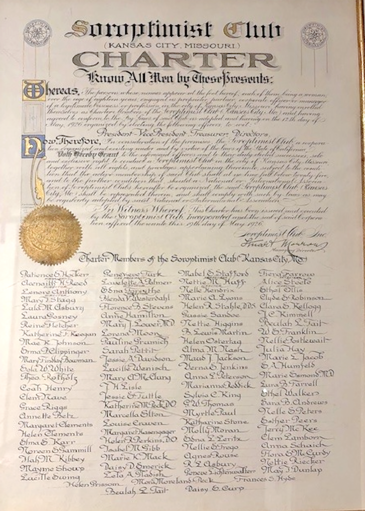 The original charter document for the Kansas City Chapter of the Soroptimist Club
